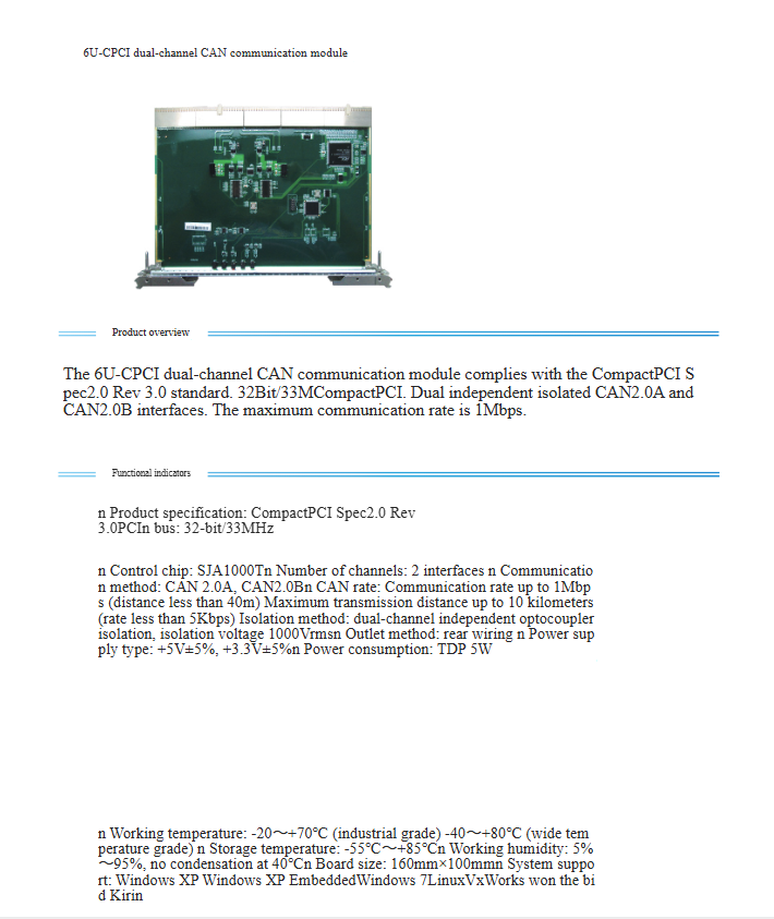 The 6U-CPCI dual-channel CAN communication module complies with the CompactPCI Spec2.0 Rev 3.0 standard. 32Bit33MCompactPCI. Dual independent isolated CAN2.0A andCAN2.0B interfaces. The maximum communication rate is lMbps.