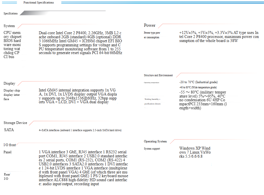 Product overview 6U CPCI Intel GM45 motherboard supports Intel Core™2 Duo processor, surface-mounted memory, more reliable operation.Supports onboard 2.5-inch SATA storage devices, supports VGA, LVDS, DVI display interfaces, supports 4-channel Gigabit Ethernet interfaces. Equipped with POST function indicator lights to monitor boot status in real-time.