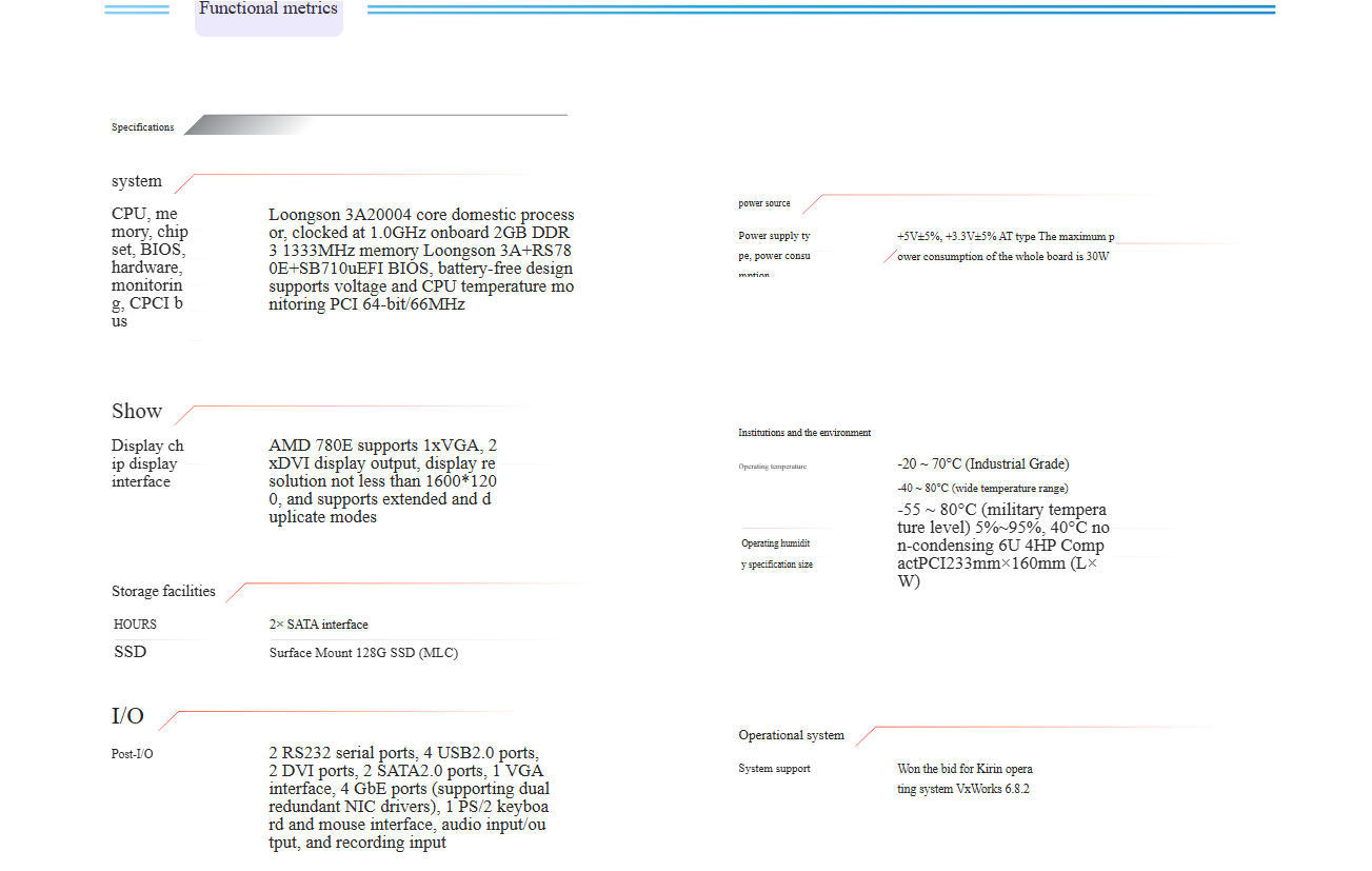 The 6U CPCI 3A 2000 motherboard is equipped with a domestic 3A 2000 processor. Surface-mounted memory, more reliable operation. Fully compatible with domestic naval standard onboard, 128GB solid-state storage. Support VGA, DVI display interface.