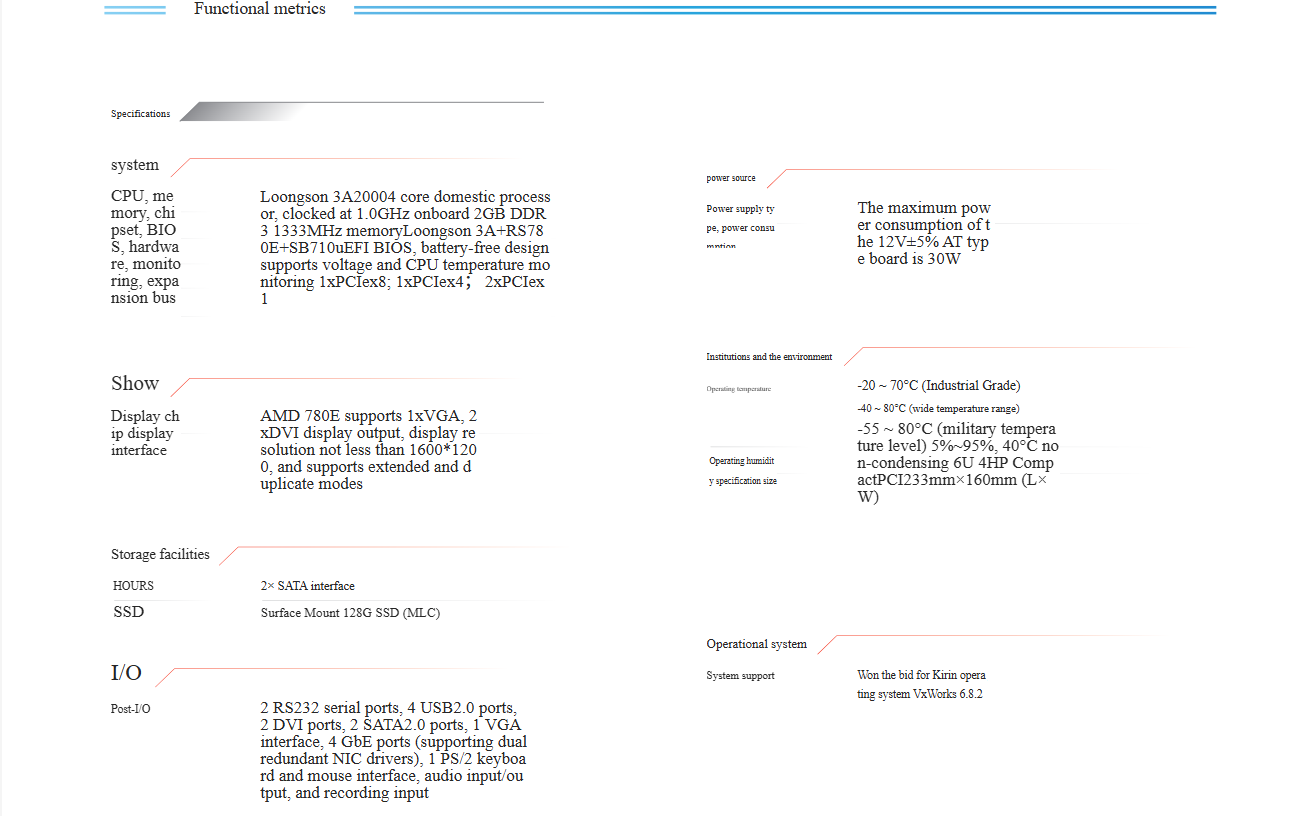 The 6U CPEX 3A motherboard is equipped with a domestic 3A 2000 processor. Surface-mounted memory, more reliable operation. Fully compatible with the domestic navy standard onboard 128GB solid-state storage. Support VGA, DVI display interface.